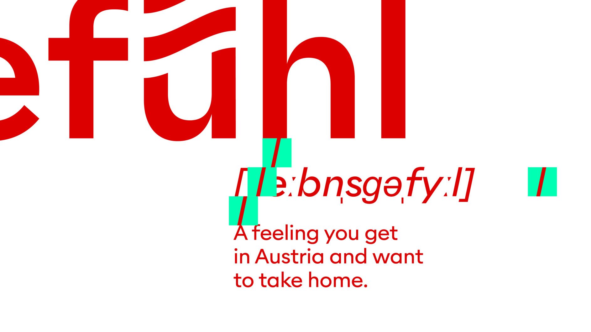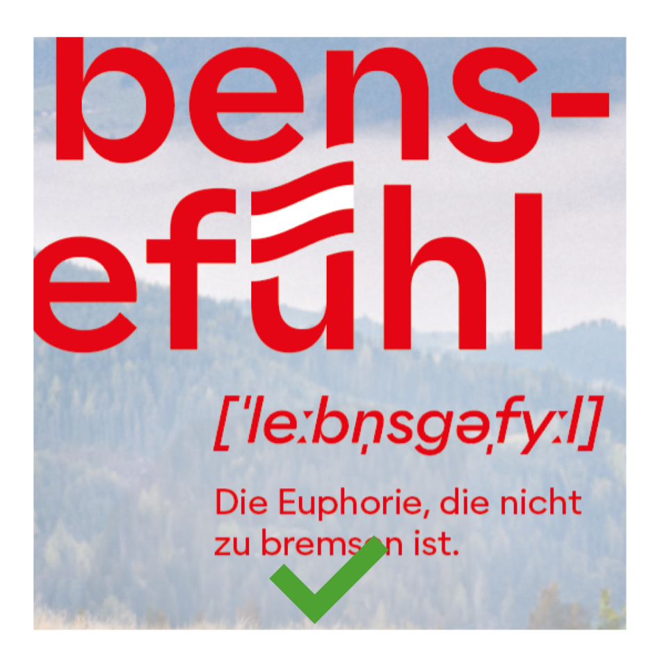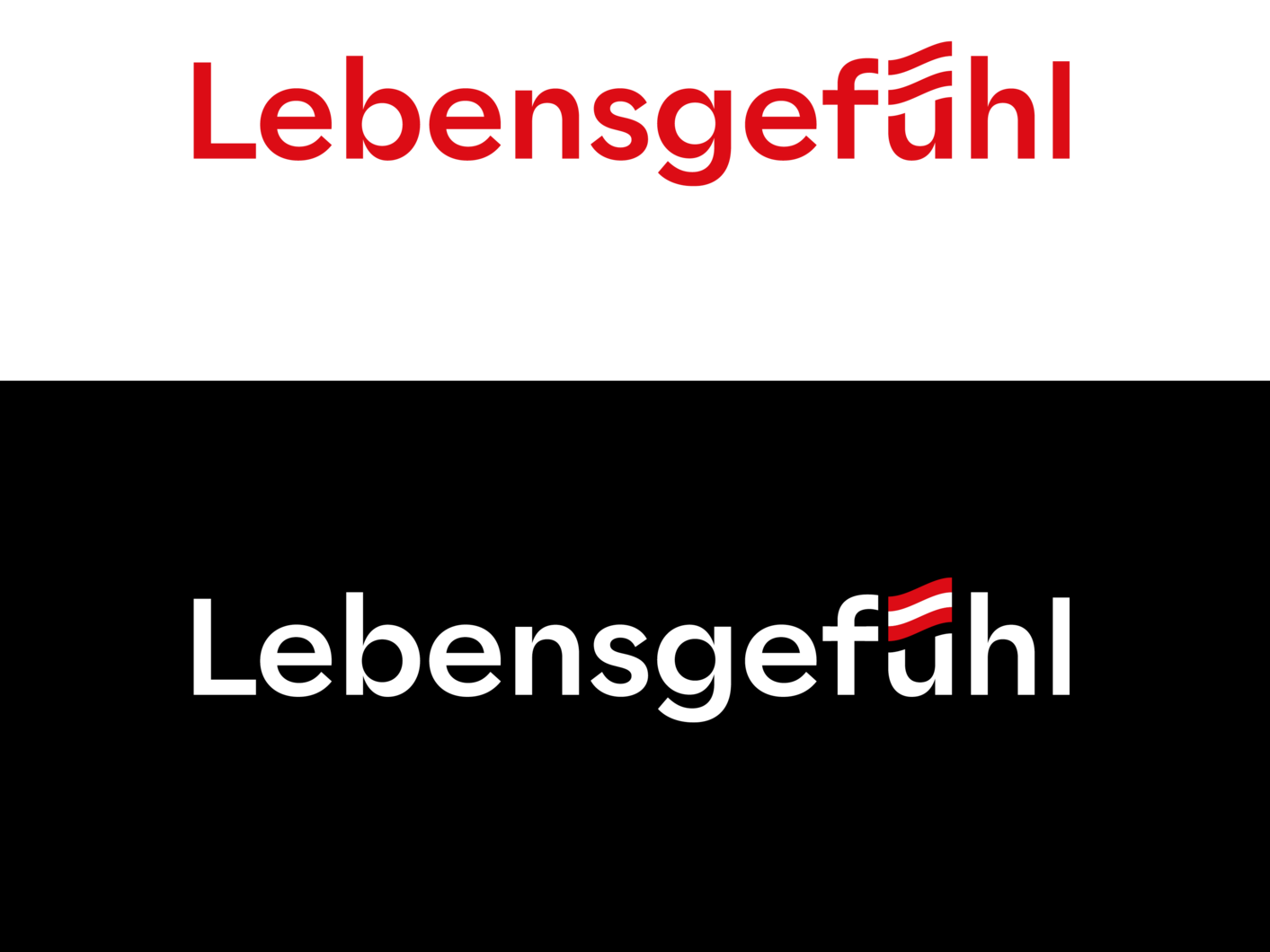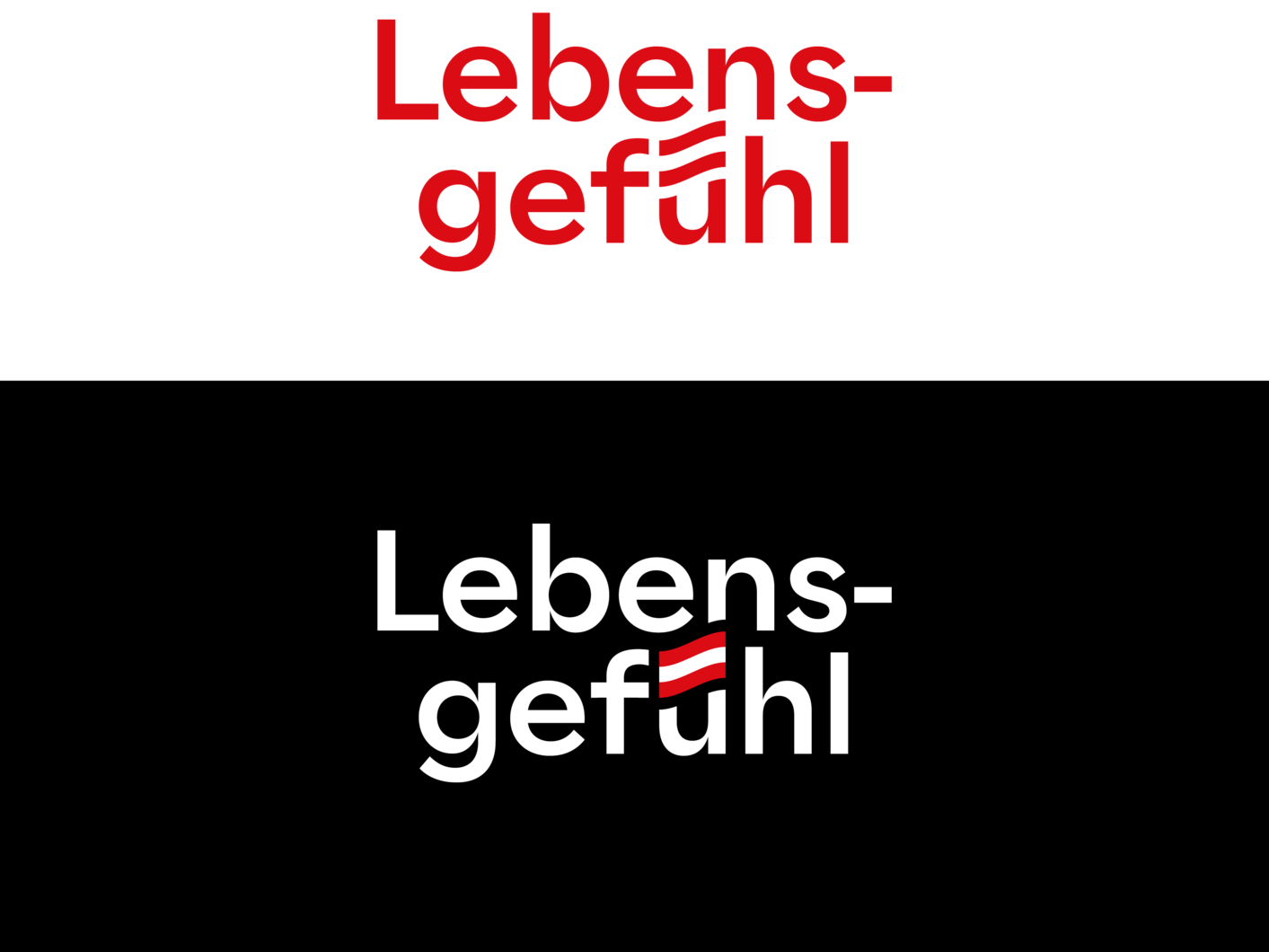 Das Lebensgefühl ist untrennbar mit Österreich verbunden – diese Erkenntnis wird gestalterisch umgesetzt, indem das Wort „Lebensgefühl“ direkt an „Österreich“ geknüpft wird. Um das „Lebensgefühl“ für Österreich zu ownen, wird die Flagge direkt in das Wort integriert.