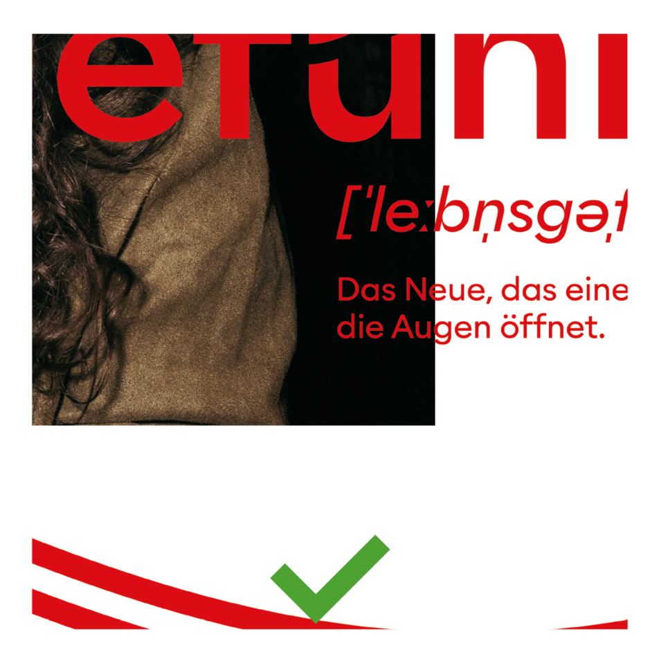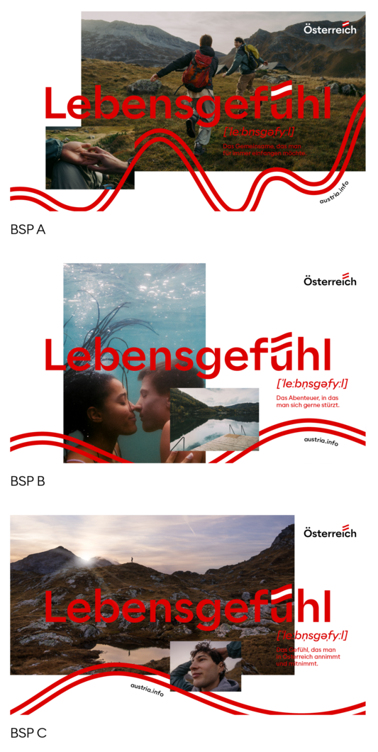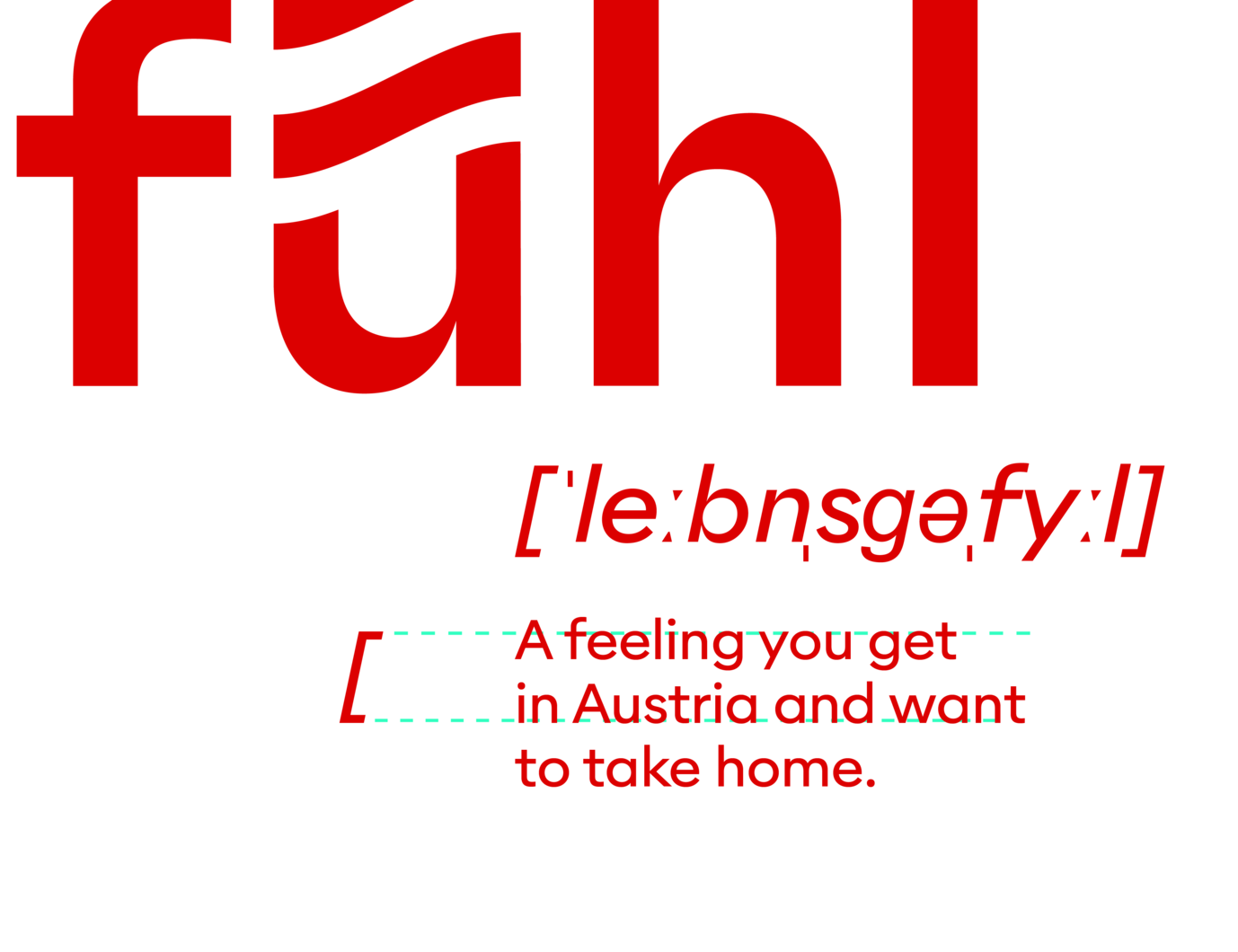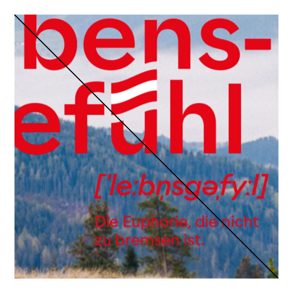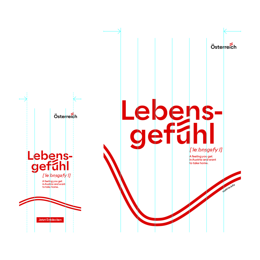 Das Lebensgefühl ist untrennbar mit Österreich verbunden – diese Erkenntnis wird gestalterisch umgesetzt, indem das Wort „Lebensgefühl“ direkt an „Österreich“ geknüpft wird. Um das „Lebensgefühl“ für Österreich zu ownen, wird die Flagge direkt in das Wort integriert.