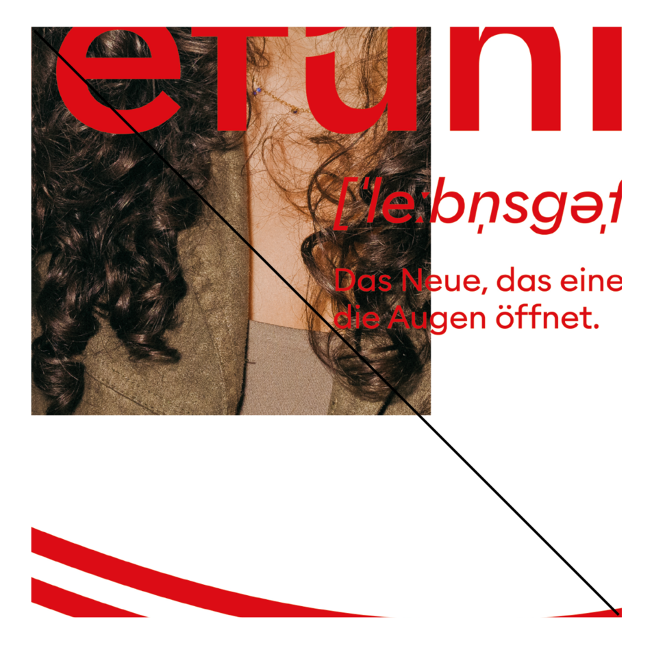 Die Minuskel des Buchstabens „L“ aus der Lautschrift dient als Abstandsmaß zwischen den Textelementen: Einerseits ist es der Abstand von der Grundlinie des Lebensgefühls zur Versalhöhe der Lautschrift und andererseits von der Grundlinie der Lautschrift zur Subline.