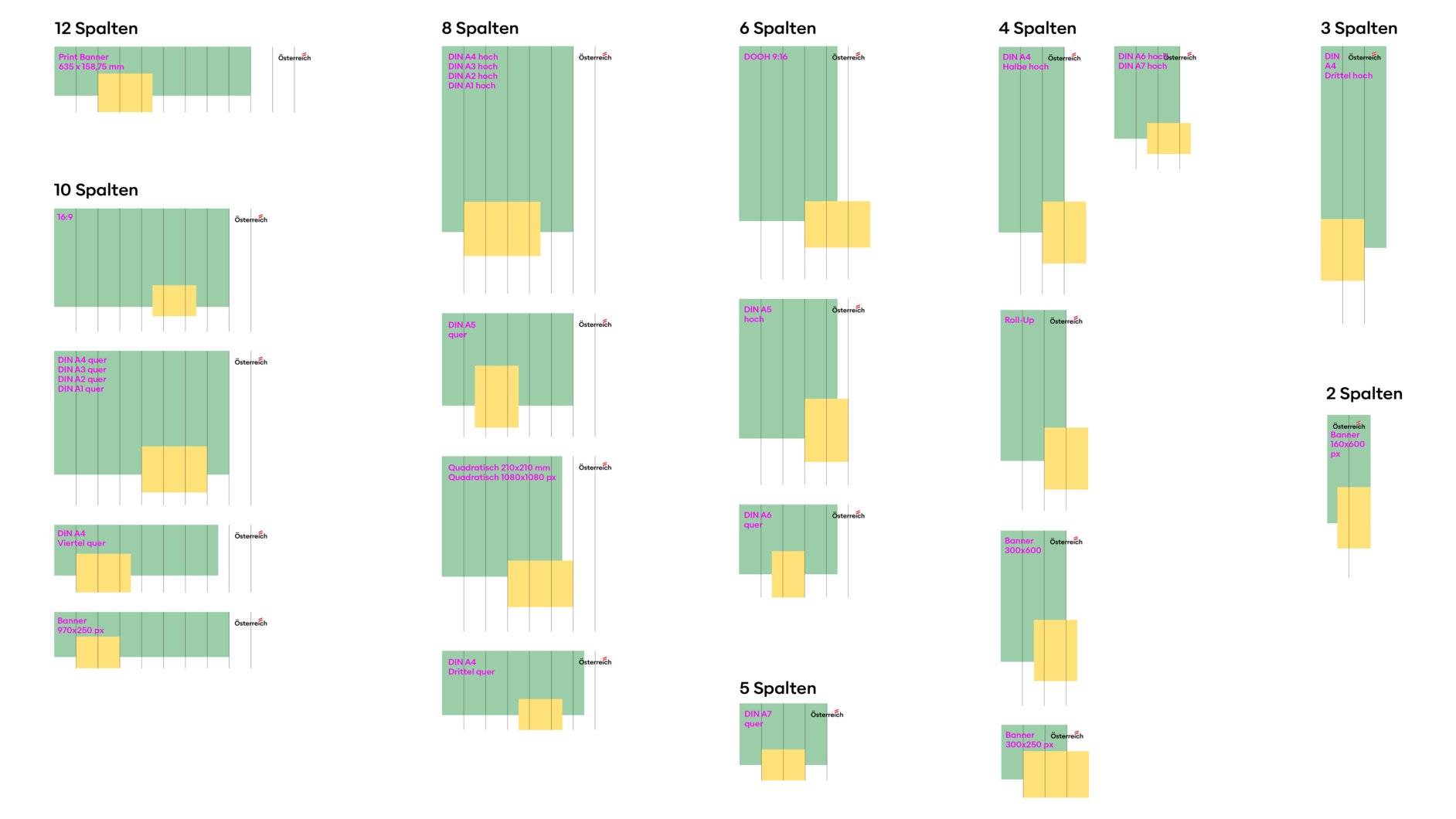 Die Anzahl der Rasterspalten richtet sich nach dem Format. Sollte ein Format gewünscht werden, für das es keine Master-Vorlage gibt, kann man sich an einer Vorlage orientieren, die den neuen Verhältnissen am nächsten kommt. Fällt dadurch das Logo nicht in der richtigen Größe aus, muss die Spaltenanzahl dementsprechend angeglichen werden.