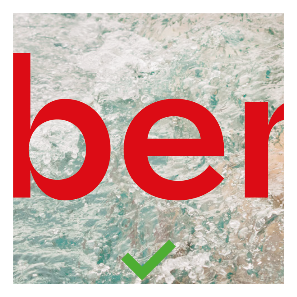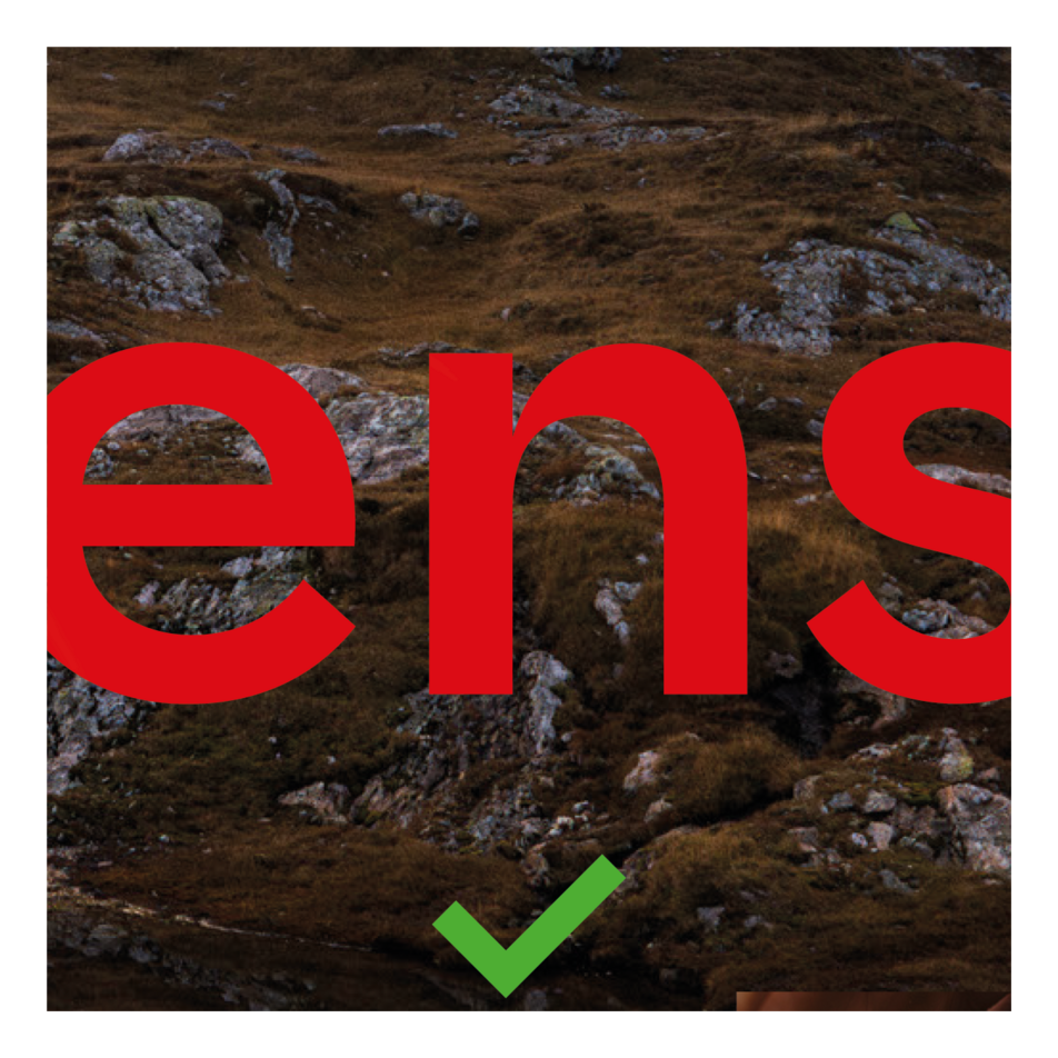 Bildbearbeitung kann die Lesbarkeit für große Headlines auf jeden Fall gewährleisten. Was bedeutet in diesem Fall gute Bildbearbeitung? Man dunkelt den Bereich hinter der Schrift ab oder hellt ihn auf. Jedoch großflächig, weich und achtsam genug, dass man als Betrachter:in nicht das Gefühl hat, die Schrift hat einen Schlagschatten oder einen Schein nach außen. (BSP A) Das muss individuell bei jedem Bild mit Gefühl gemacht werden. Manchmal reicht es, einzelne Teile wie z.B. ein Kleidungsstück umzufärben oder abzudunkeln/aufzuhellen.