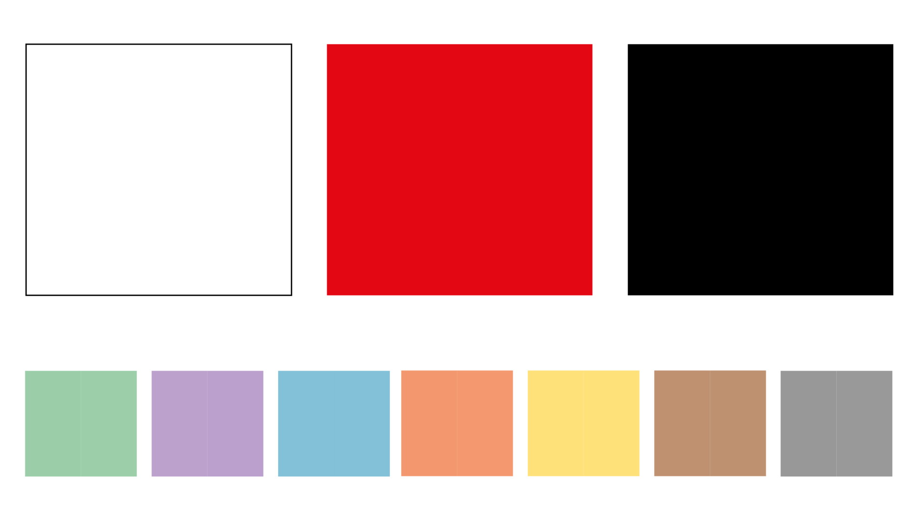 Um sich farblich klar von den satten Primärfarben abzugrenzen, sind die Sekundärfarben in einer Pastellpalette gehalten. Somit rücken die Grundfarben im gemeinsamen Einsatz automatisch hierarchisch in den Vordergrund und heben sich sichtlich ab.