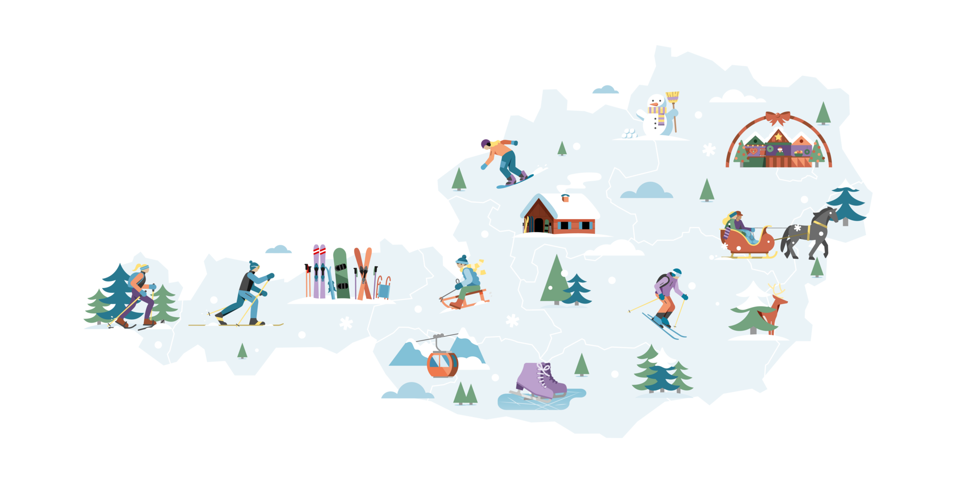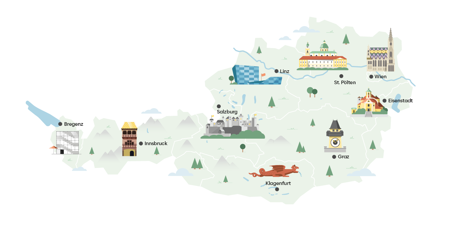 Die Illustrationen sind in der Sekundärfarbpalette angelegt. Das ÖW-Rot kommt nicht vor.