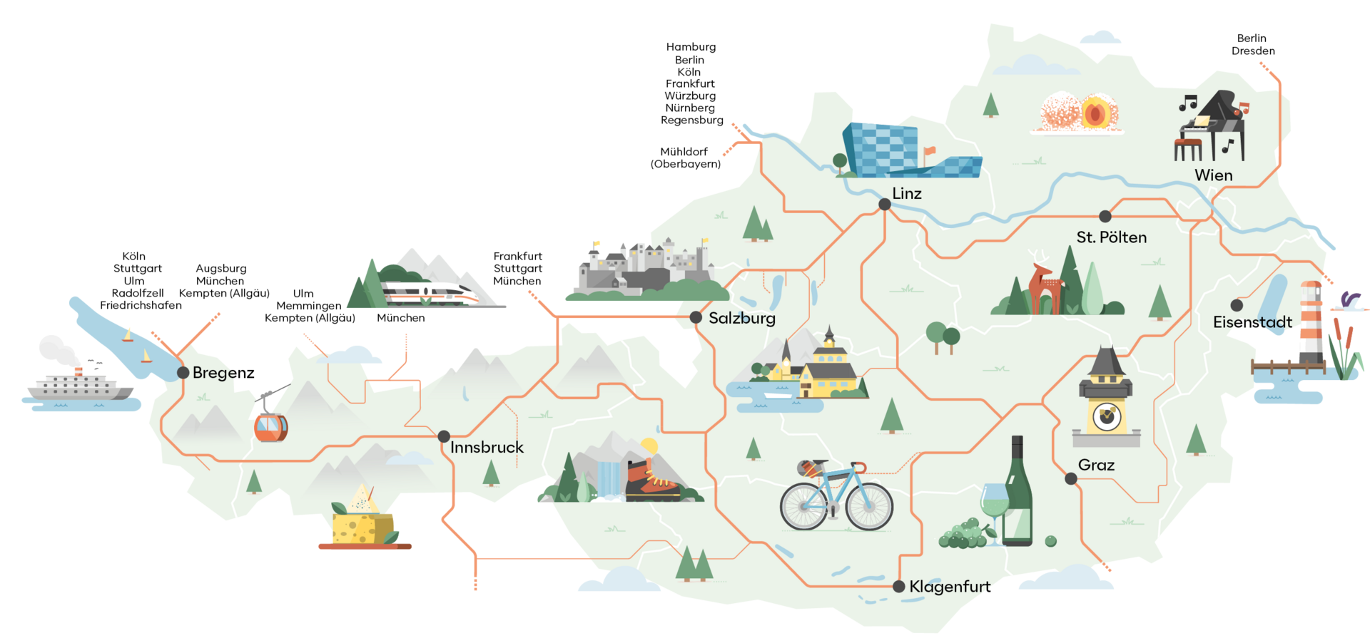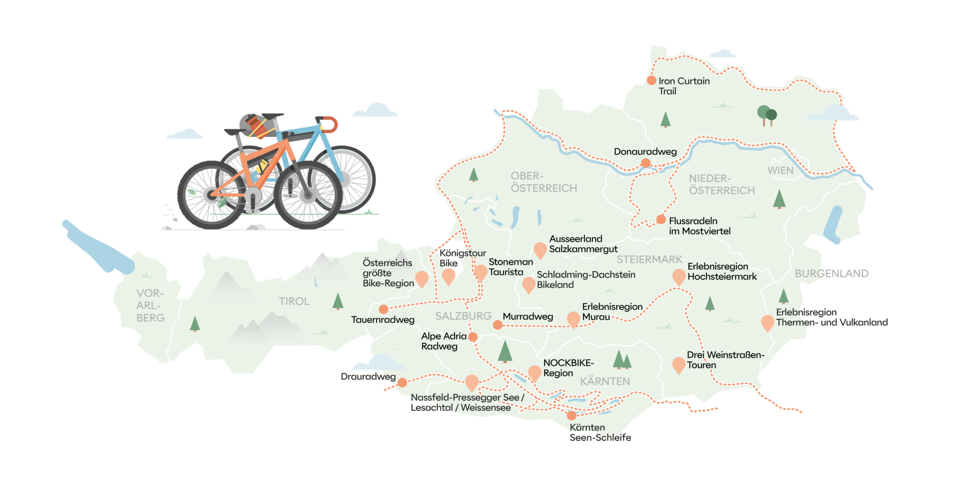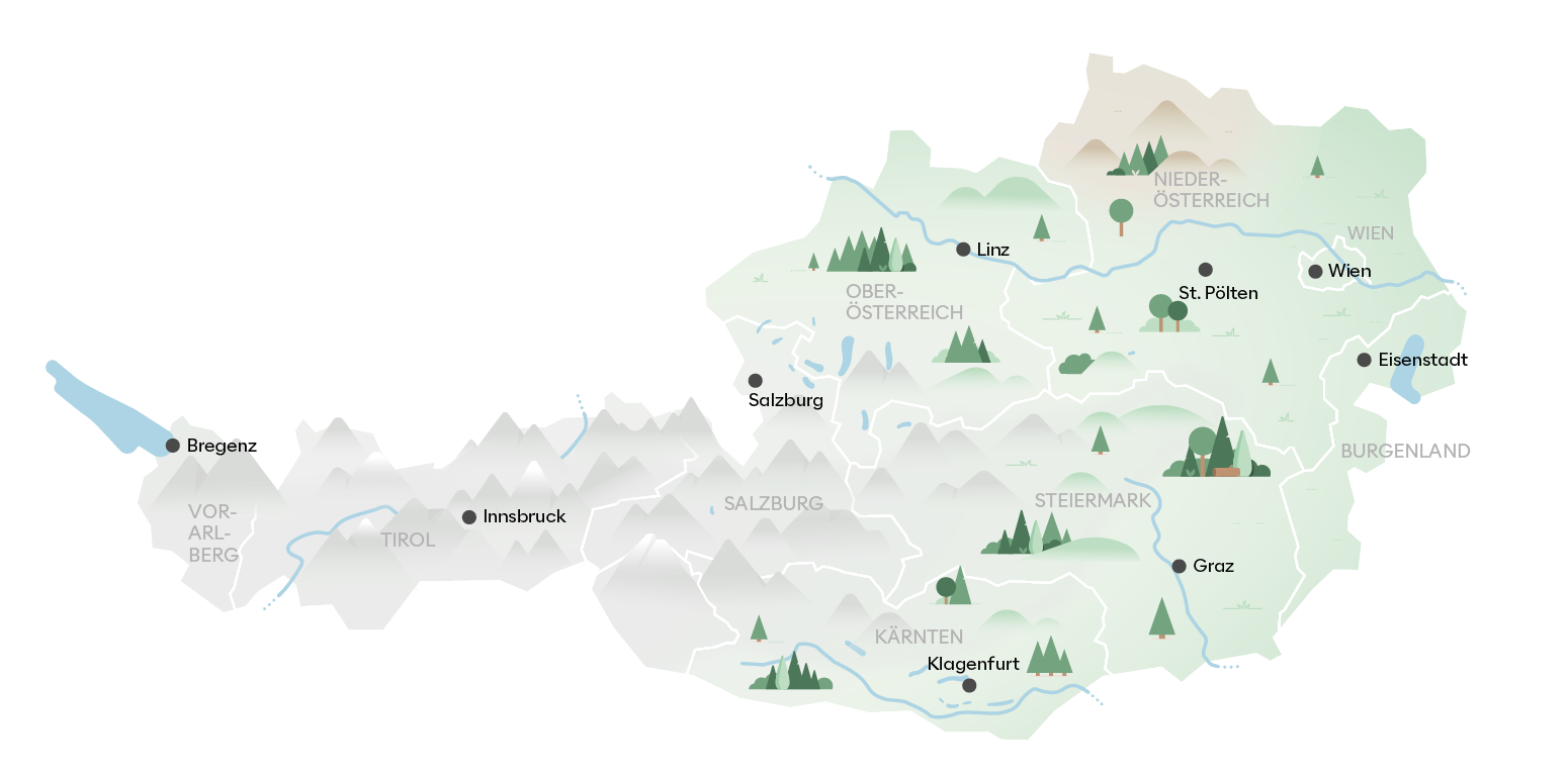 Bundeslandgrenzen, Landeshauptstädte, angrenzende Staaten, Flüsse, Seen, Berge, Nationalparks, Radrouten, Kulinarik, Sehenswürdigkeiten und vieles mehr.