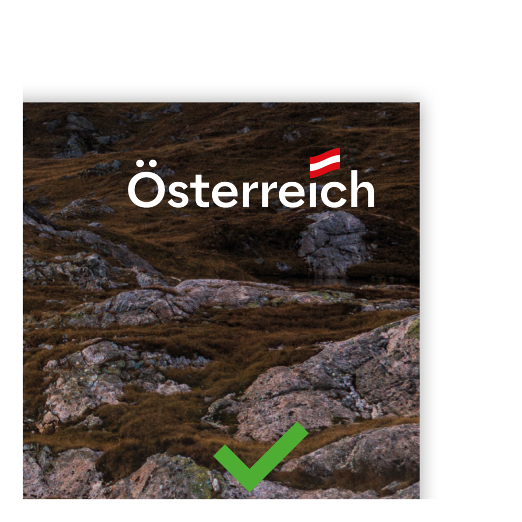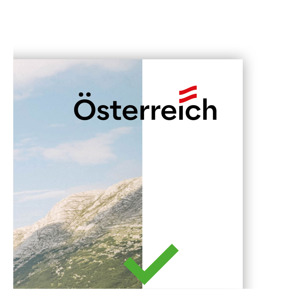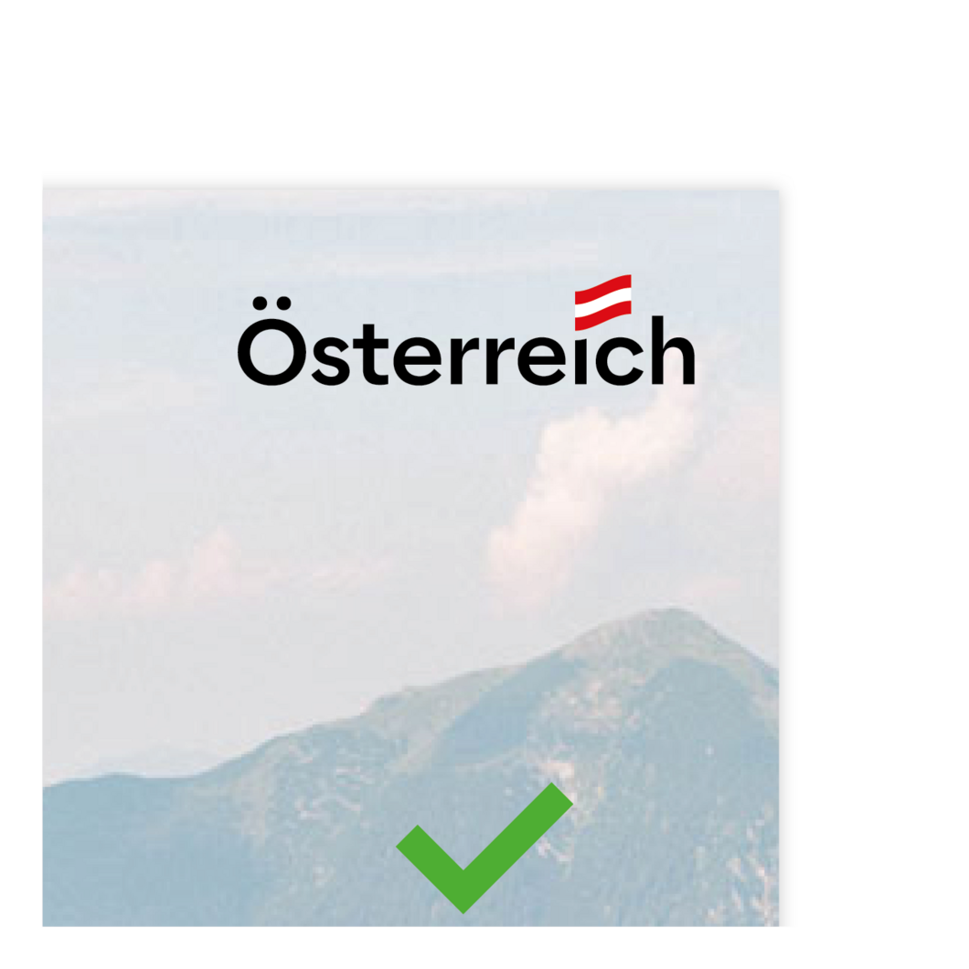 Das Österreich-Logo mit der roten Flagge ist immer zu setzen. Sollten es die Umstände nicht erlauben, wie beispielsweise durch Druckspezifikationen, ist auf das alternative Logo in Graustufen zurückzugreifen. Die schwarz-weiße Logo-Alternative kommt ausschließlich bei einfarbigem Druck zum Einsatz. Logomutationen sind in jedem Fall zu vermeiden, um Eigenständigkeit und Stringenz im Design zu gewährleisten.
