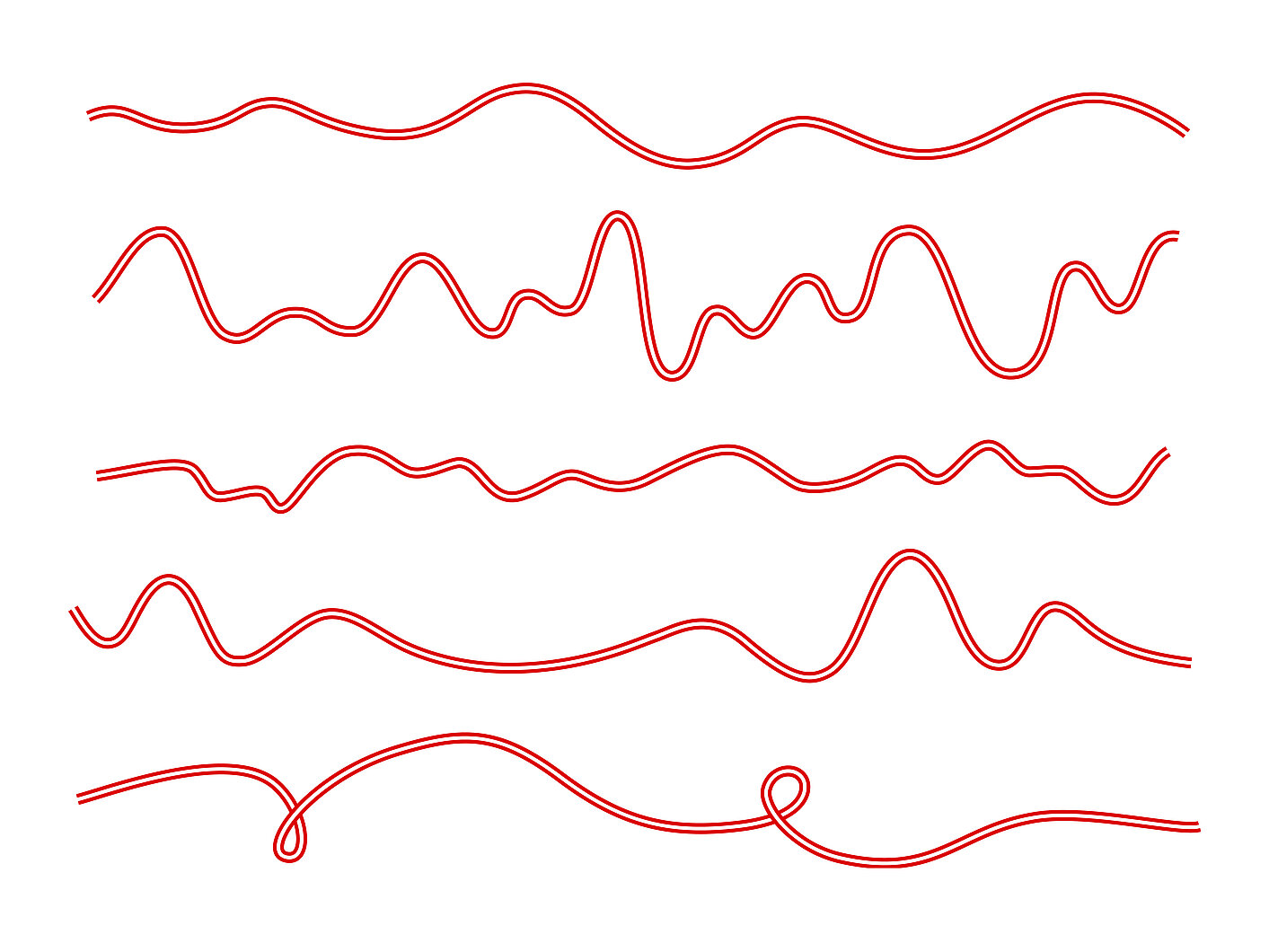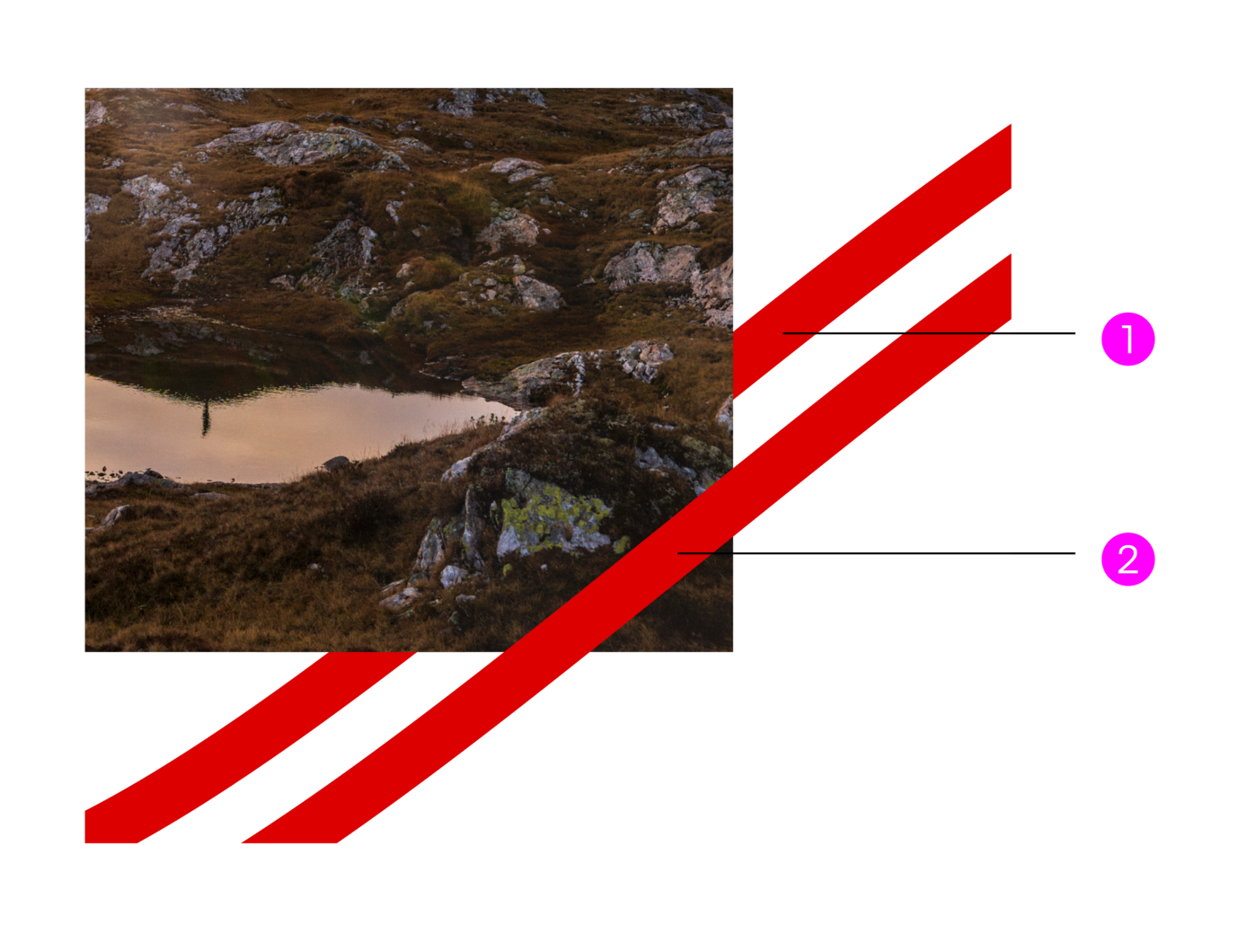 Der Vibe soll eine fließende Illusion vermitteln: Er hat keinen Anfang und kein Ende und schlängelt sich immer leicht abfallend über das jeweilige Layout. Wenn es sich um ein mehrseitiges oder 3-dimensionales Druckprodukt handelt, setzt sich der Vibe auf der Folgeseite so nahtlos wie möglich fort.